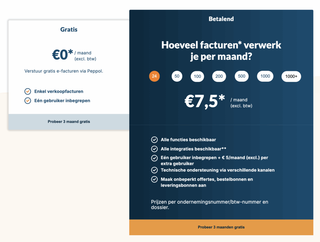 Verwacht je maar enkele facturen uit België? Dan kan je bij Billit een gratis account krijgen. Zijn het er meer, dan zijn de kosten afhankelijk van het aantal facturen dat verstuurd moeten worden; vanaf 7,50 euro per maand. Kijk onderaan op deze pagina voor de tarieven.